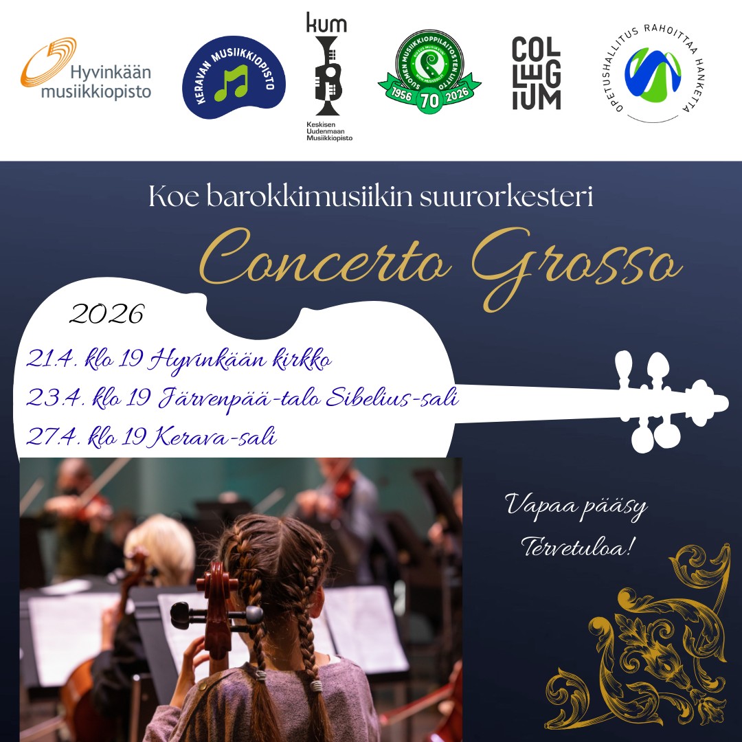 Hyvinkään, Keravan ja Keskisen Uudenmaan musiikkiopistojen sekä Collegiumin yhteisprojekti Concerto Grosso tuo barokkimusiikin suurorkesterin Hyvinkään kirkkoon tiistaina 21.4. klo 19, Järvenpää-talon Sibelius-saliin to 23.4. klo 19 ja Kerava-saliin ma 27.4. klo 19. Opetushallitus rahoittaa hanketta. Konsertteihin on vapaa pääsy. Lämpimästi tervetuloa!